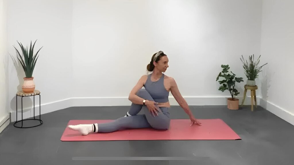 - Κρατήστε το γόνατο με τα δυο σας χέρια και τραβήξτε απαλά προς το στήθος, στρέφοντας τον κορμό στην αντίθετη πλευρά.
