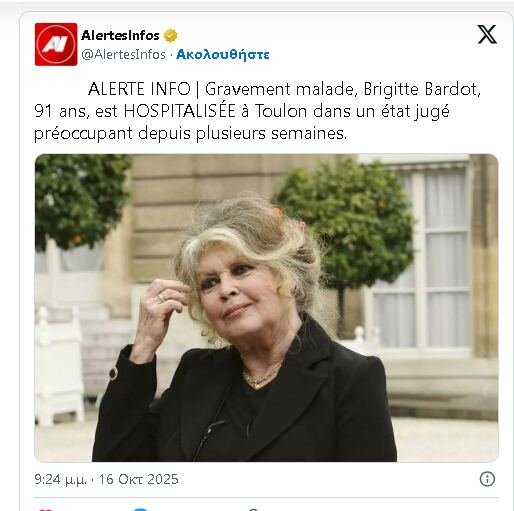 Η 91χρονη Mπαρντό «αναγκάστηκε να εγκαταλείψει το ησυχαστήριό της, τη βίλα Λα Μαντράγκ, και νοσηλεύεται σε ιδιωτική κλινική στην περιοχή της Τουλόν, στη νότια Γαλλία» σημειώνει το ρεπορτάζ γαλλικής εφημερίδας.