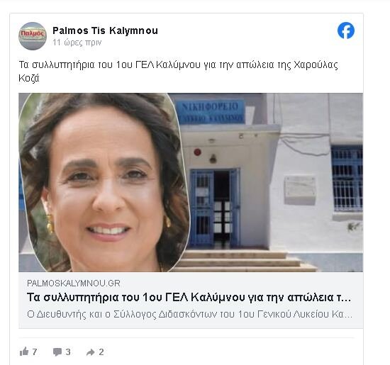 Τα συλλυπητήρια του 1ου ΓΕΛ Καλύμνου για την απώλεια της Χαρούλας Κοζά