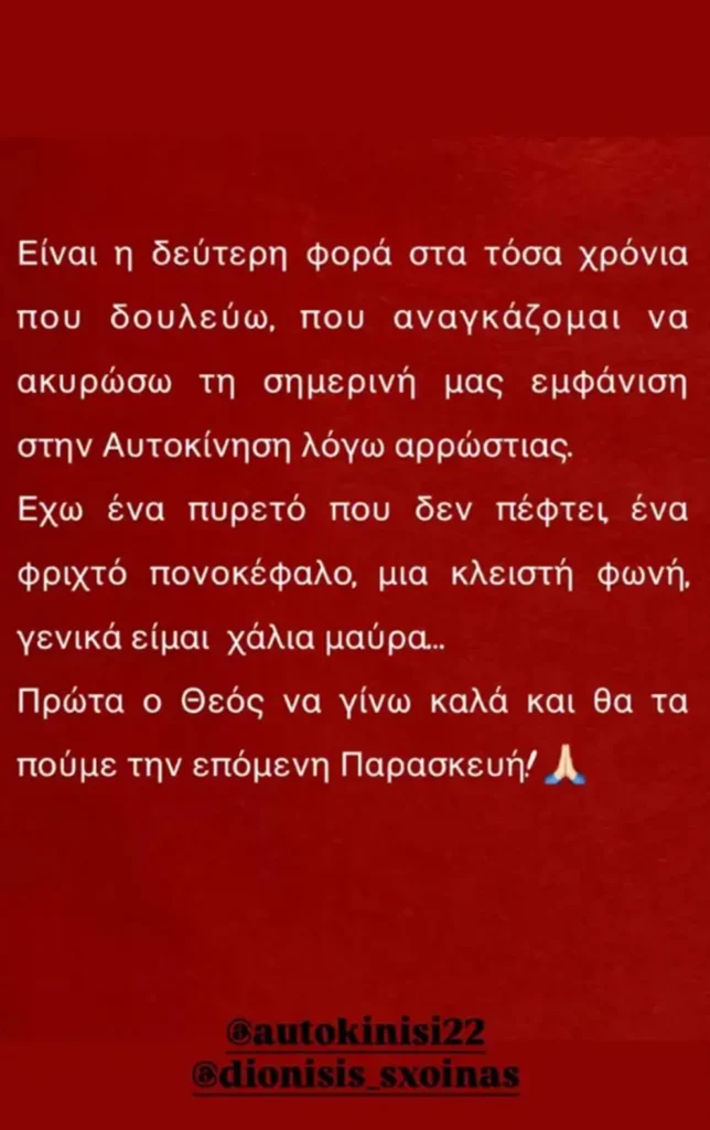 «Είναι η δεύτερη φορά στα τόσα χρόνια που δουλεύω, που αναγκάζομαι να ακυρώσω τη σημερινή μας εμφάνιση στην Αυτοκίνηση λόγω αρρώστιας. Έχω ένα πυρετό που δεν πέφτει, ένα φριχτό πονοκέφαλο, μια κλειστή φωνή, γενικά είμαι χάλια μαύρα…