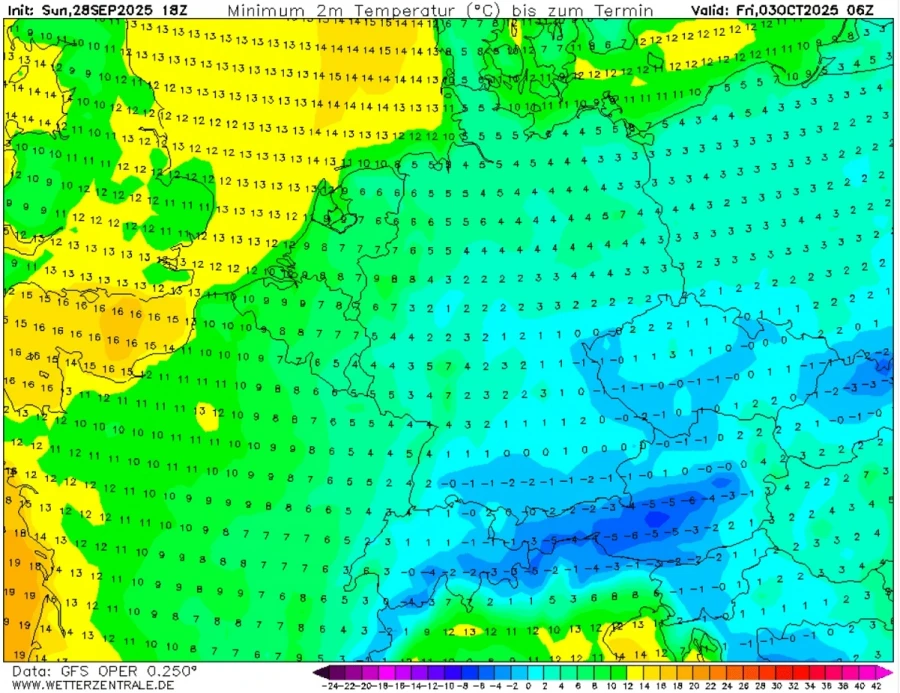 Καθώς η ψυχρή μάζα από την ανατολική Ευρώπη βαθαίνει και εξαπλώνεται δυτικά, η θερμοκρασία θα πέσει κάτω από το μηδέν στο επίπεδο των 850 mbar (περίπου στα 1.250 μέτρα υψόμετρο) την Πέμπτη και την Παρασκευή, περίπου 10 βαθμούς κάτω από τα φυσιολογικά για την εποχή. Πρόκειται για τις χαμηλότερες θερμοκρασίες που θα έχουν καταγραφεί ως τώρα το φετινό φθινόπωρο.