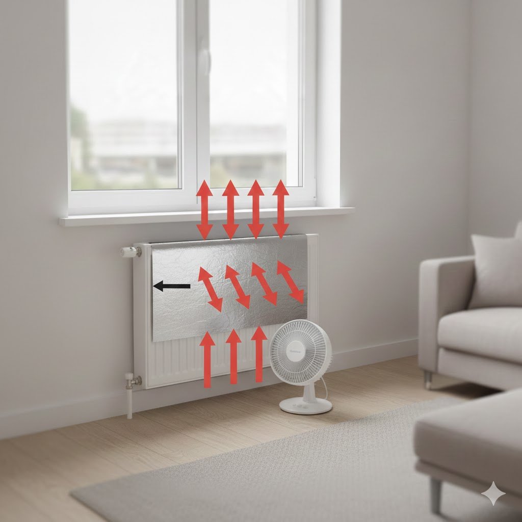 Τοποθέτηση: Τοποθέτησε το πάνελ στον τοίχο πίσω από το καλοριφέρ, με την ανακλαστική (ασημένια) πλευρά να κοιτάζει προς το σώμα.