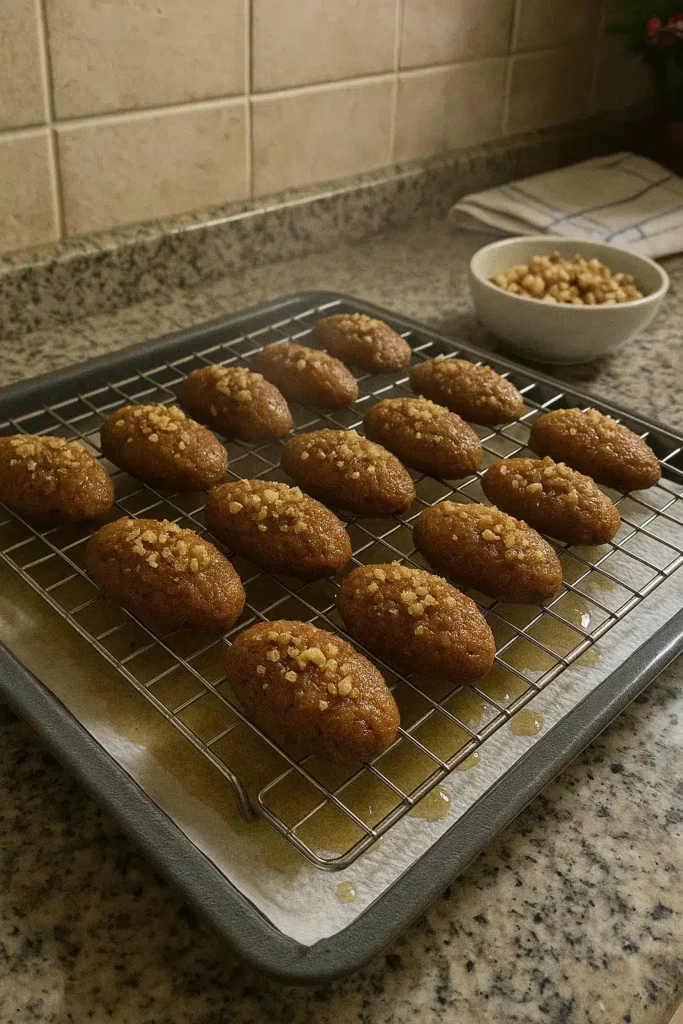 Η λύση: Το μέλι δεν βράζει. Βράζεις νερό-ζάχαρη/αρωματικά 2–3’, αποσύρεις και τότε προσθέτεις μέλι. Ψήσιμο: Αντιστάσεις 175–180°C | Αέρας 160–170°C, 20–25’ μέχρι βαθύ χρυσαφί (όχι καφέ).