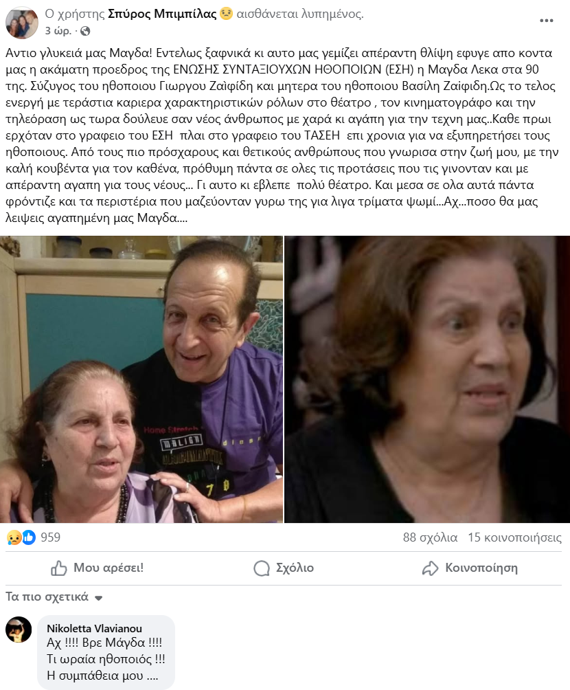 «Αντίο γλυκεία μας Μάγδα. Εντελώς ξαφνικά κι αυτό μας γεμίζει απέραντη θλίψη, έφυγε από κοντά μας η ακάματη πρόεδρος της Ένωσης Συνταξιούχωνς Ηθοποιών (ΕΣΗ) η Μάγδα Λέκκα στα 90 της. Σύζυγος του ηθοποιού Γιώργου Ζαϊφιδη και μητέρα του ηθοποιού Βασίλη Ζαϊφιδη. Ως το τέλος ενεργή με τεράστια καριέρα χαρακτηριστικών ρόλων στο θέατρο, τον κινηματογράφο και την τηλεόραση. Ως τώρα δούλευε σαν νέος άνθρωπος με χαρά κι αγάπη για την τέχνη μας.