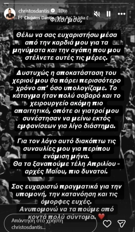 Ο Χρήστος Δάντης ευχαρίστησε το κοινό του για τα μηνύματα στήριξης, αλλά και την υπομονή τους, εκφράζοντας την ελπίδα να τα πουν σύντομα από κοντά.