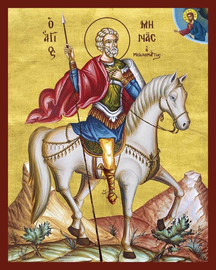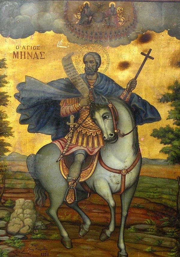 Ο Άγιος Μηνάς γεννήθηκε το 245 μ.Χ. στο Νίκιο, μια περιοχή της Κάτω Αιγύπτου. Οι γονείς του ήταν ειδωλολάτρες, όμως εκείνος από νεαρή ηλικία γνώρισε τον Χριστό. Με ζήλο και πίστη αγωνίστηκε να τηρεί τις εντολές του Θεού και να διαμορφώσει έναν ενάρετο και υποδειγματικό χαρακτήρα.