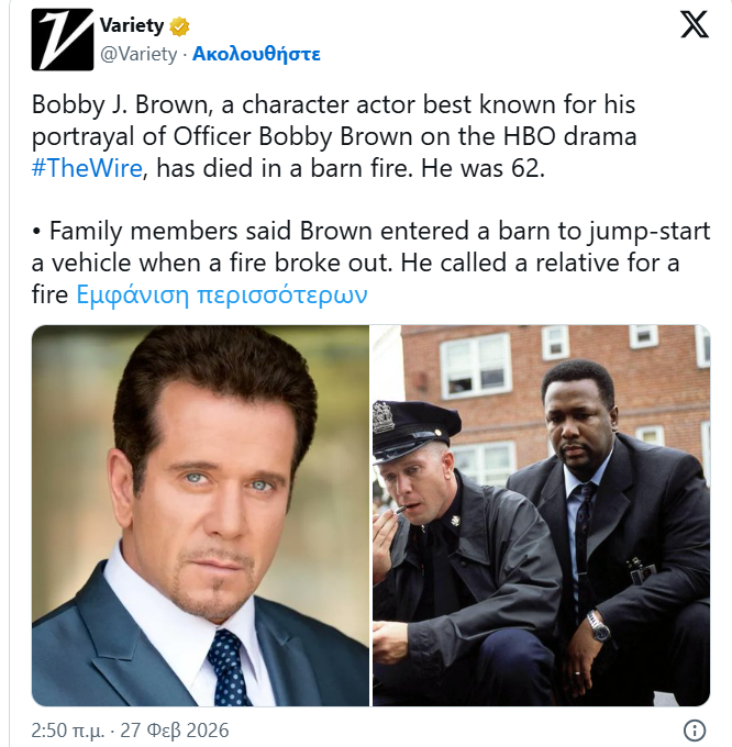 Ο Μπόμπι Τζ. Μπράουν, ηθοποιός χαρακτήρων που έγινε ευρύτερα γνωστός από τον ρόλο του αστυνομικού Μπόμπι Μπράουν στη δραματική σειρά του HBO «The Wire», πέθανε την Τρίτη έπειτα από φωτιά σε αχυρώνα στο Μέριλαντ. Ήταν 62 ετών.