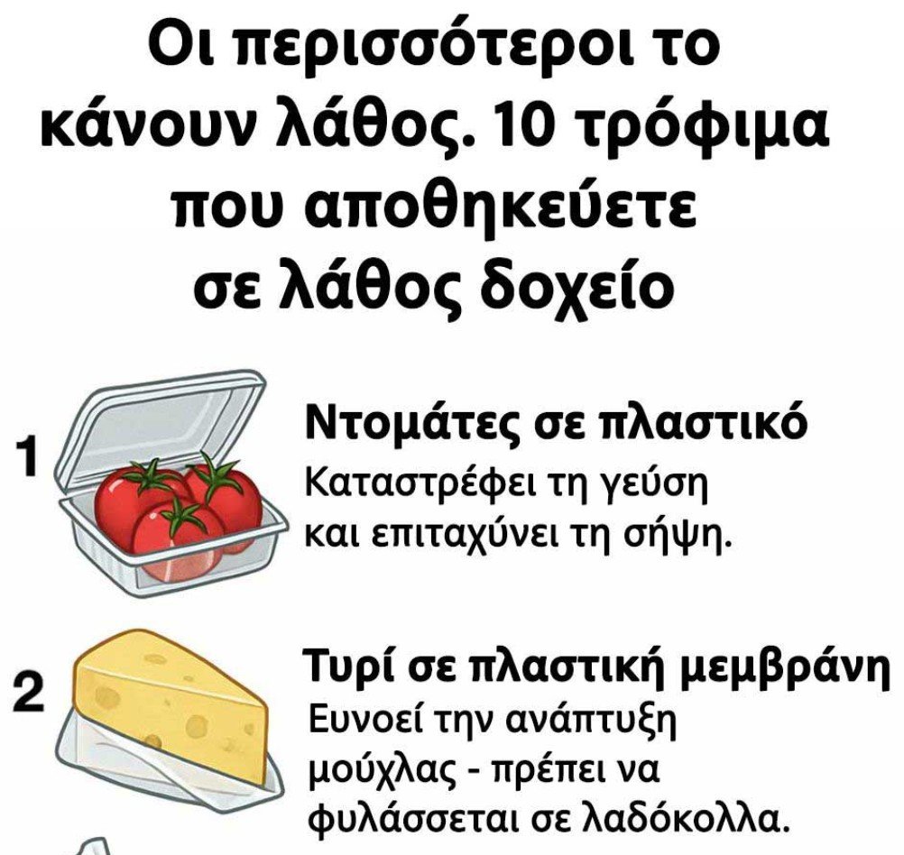 Σε αυτό το άρθρο θα δούμε δέκα κοινά τρόφιμα που συνήθως αποθηκεύονται λανθασμένα. Μαθαίνοντας τη «λογική» πίσω από τη σωστή αποθήκευση και κάνοντας μερικές απλές αλλαγές, μπορείτε να παρατείνετε τη διάρκεια ζωής των τροφίμων σας και να τα απολαμβάνετε στην καλύτερη τους μορφή.