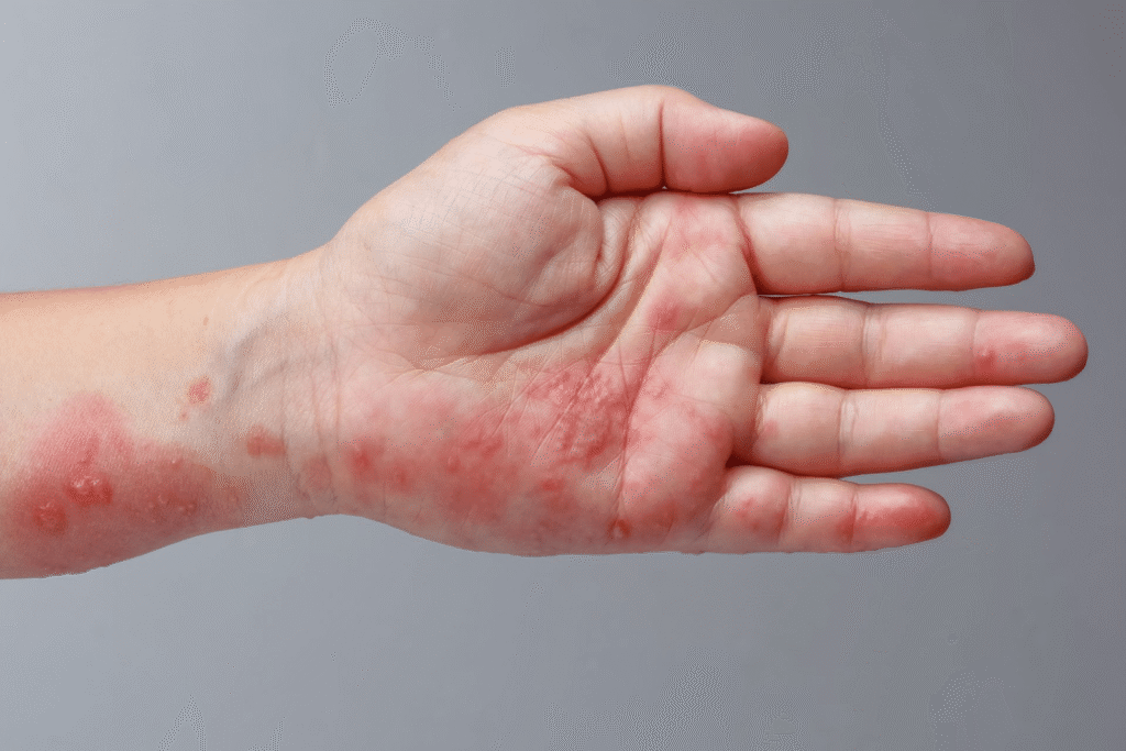 Δερματικό εξάνθημα: κόκκινα μπαλώματα που εξελίσσονται σε φουσκάλες γεμάτες με υγρά.