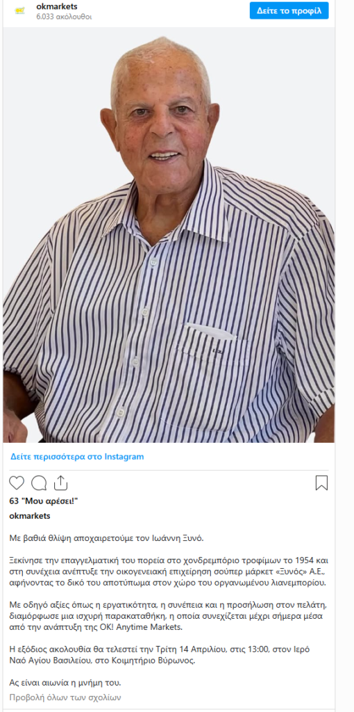 «Με βαθιά θλίψη αποχαιρετούμε τον Ιωάννη Ξυνό. Ξεκίνησε την επαγγελματική του πορεία στο χονδρεμπόριο τροφίμων το 1954 και στη συνέχεια ανέπτυξε την οικογενειακή επιχείρηση σούπερ μάρκετ “Ξυνός” Α.Ε., αφήνοντας το δικό του αποτύπωμα στον χώρο του οργανωμένου λιανεμπορίου.
