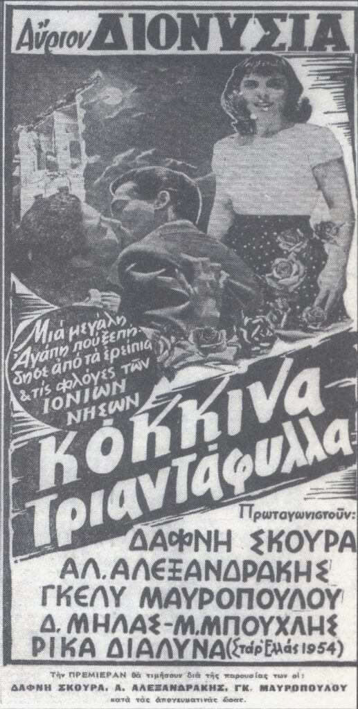 Γυρνάμε σήμερα το χρόνο πίσω και συγκεκριμένα φθάνουμε στο έτος 1955. Τότε που προβλήθηκε η ταινία με Κεφαλονίτικο ενδιαφέρον, ” Κόκκινα τριαντάφυλλα”, όπου έκοψε 15.794 εισιτήρια. Βρέθηκε στην 18η θέση σε 24 ταινίες τη συγκεκριμένη χρονική περίοδο. Το σενάριο ήταν του Κεφαλονίτη, Διονύση Μήλα, που πέθανε 2 χρόνια αργότερα σε νεαρή ηλικία και πρωταγωνίστησαν οι Αλέκος Αλεξανδράκης, Γκέλυ Μαυροπούλου, Ρίκα Διαλυνά, Δάφνη Σκούρα.