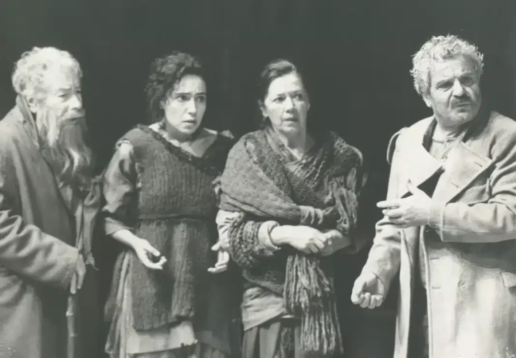 Ο Σπύρος Κωνσταντόπουλος (Θεράπων), η Βίκυ Πρωτογεράκη (Κόρη), η Μαρία Κωνσταντάρου (Γυναίκα) και ο Ιάκωβος Ψαρράς (Φύλακας) στην παράσταση «Ο Δείπνος» στο Εθνικό Θέατρο το 1993.