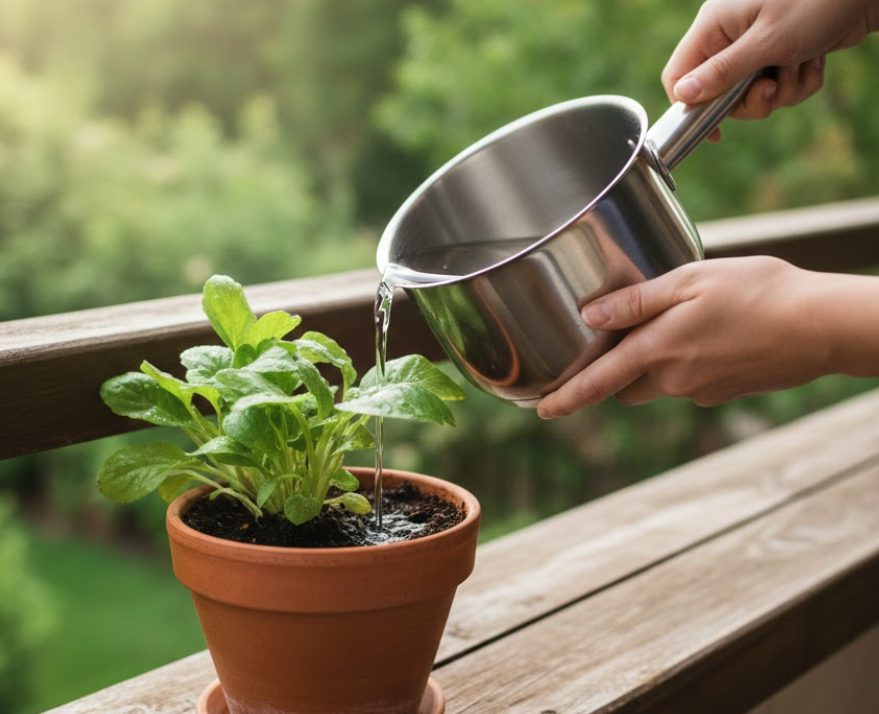 ❄️ Άσε το να Κρυώσει: Ποτέ μην ρίχνεις το καυτό νερό στο χώμα. Θα σοκάρει τις ρίζες και θα «κάψει» το φυτό. Άφησέ το στην κατσαρόλα μέχρι να έρθει σε θερμοκρασία δωματίου.