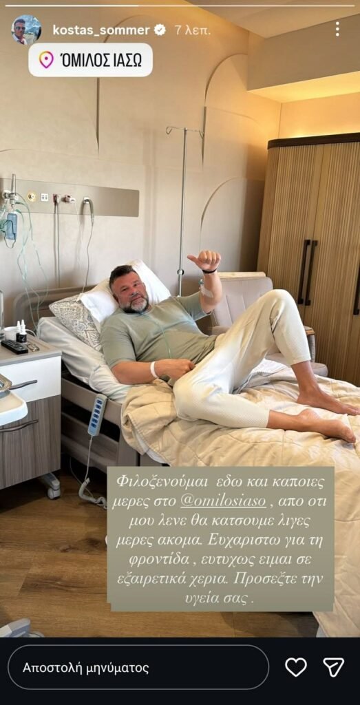 «Φιλοξενούμαι εδώ και κάποιες μέρες στο νοσοκομείο, από ό,τι μου λένε θα κάτσουμε λίγες μέρες ακόμα. Ευχαριστώ για τη φροντίδα, ευτυχώς είμαι σε εξαιρετικά χέρια. Προσέξτε την υγεία σας» έγραψε ο Κώστας Σόμμερ.