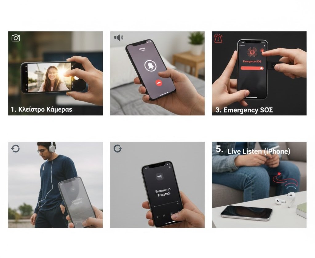 iPhone: Το να πατήσετε και να κρατήσετε πατημένα ταυτόχρονα το κουμπί λειτουργίας (Power/Side Button) και ένα από τα κουμπιά έντασης ενεργοποιεί τη λειτουργία Emergency SOS (Κλήση Έκτακτης Ανάγκης), η οποία καλεί αυτόματα τις υπηρεσίες έκτακτης ανάγκης και ενημερώνει τις επαφές σας.