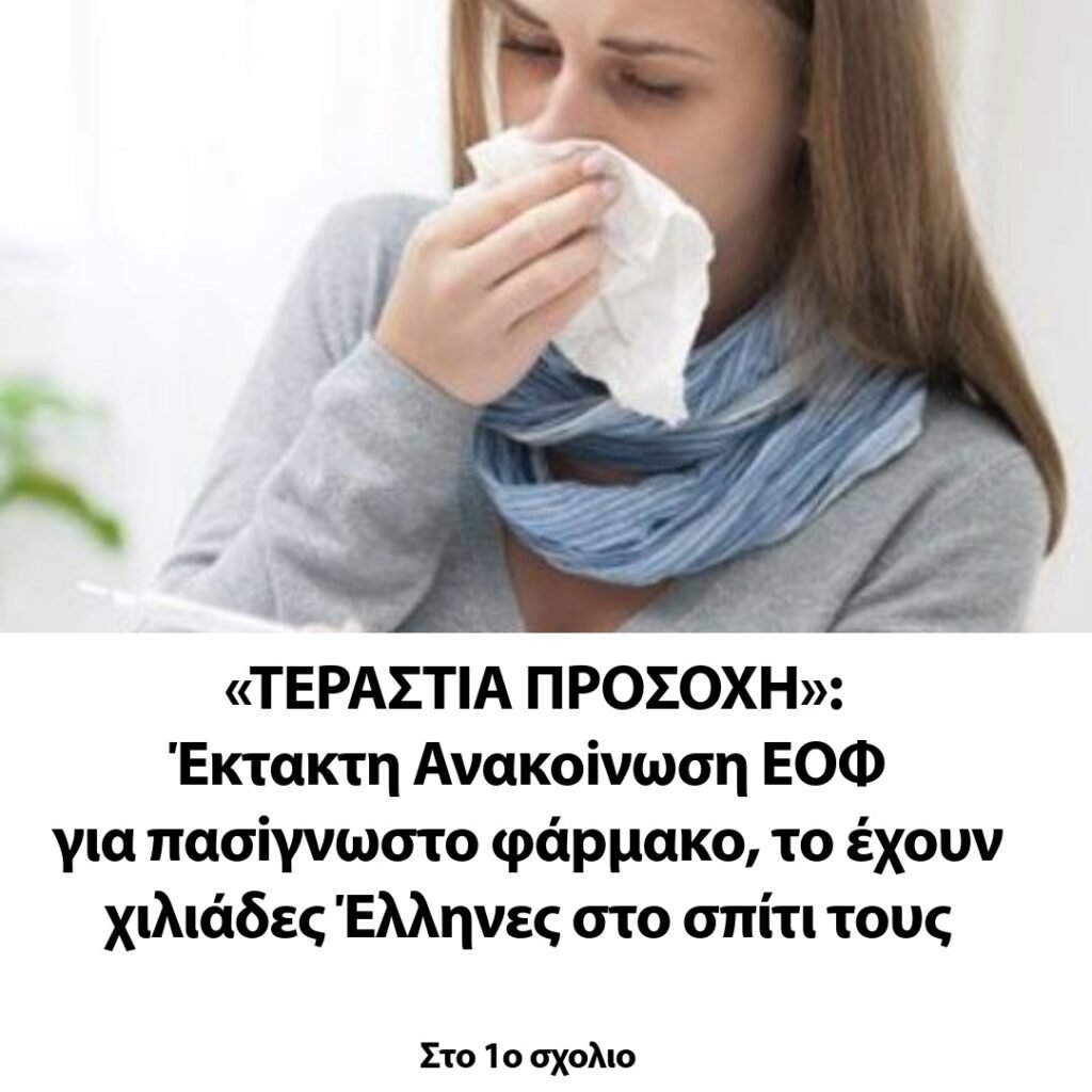 «TEPAΣTIA ΠPOΣOXH»: Έκτακτη Ανακοiνωση ΕΟΦ για πασiγνωστο φάpμακο, το έχουν χιλιάδες Έλληνες στο σπίτι τους