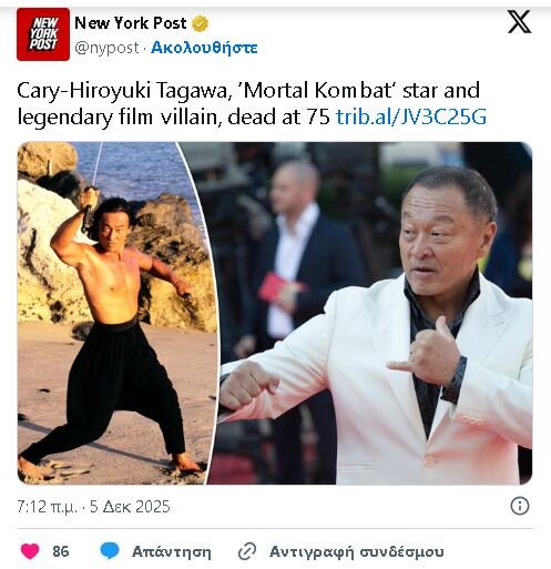 Την τελευταία του πνοή σε ηλικία 75 ετών άφησε ο Κάρι Χιρογιούκι Ταγκάουα, πρωταγωνιστής των «Mortal Kombat» και «Memoirs of a Geisha». Υπέστη εγκεφαλικό επεισόδιο