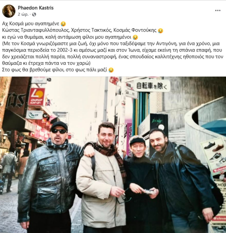 Ενώ, ο Φαίδρω Καστρής, συγκινώντας με τα λόγια του, έγραψε: «Αχ Κοσμά μου αγαπημένε. Με τον Κοσμά γνωριζόμαστε μια ζωή, όχι μόνο που ταξιδέψαμε την “Αντιγόνη” για ένα χρόνο, μια παγκόσμια περιοδεία το 2002 – 2003 και αμέσως μαζί και στον “Ίωνα. Είχαμε εκείνη τη σπάνια επαφή, που δεν χρειάζεται πολλή παρέα, πολλή συναναστροφή. Ένας σπουδαίος καλλιτέχνης ηθοποιός που τον θαύμαζα κι έτρεχα πάντα να τον χαρώ».