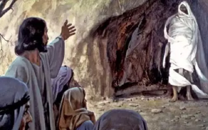 Ο Ιησούς δάκρυσε και ζήτησε να τον οδηγήσουν στον τάφο -ένα σπήλαιο φραγμένο με πέτρα βαριά. Παρότι προειδοποιήθηκε ότι, η οσμή θα ήταν ανυπόφορη, περίμενε να ανοίξει η είσοδος του τάφου και υψώνοντας φωνή μεγάλη είπε: «Λάζαρε δεύρο έξω!». Ο Χριστός ανάστησε τον Λάζαρο τέσσερις ημέρες μετά τον θάνατό του -εξού και ο χαρακτηρισμός «Τετραήμερος». Γιατί ο Λάζαρος δεν ξαναγέλασε ποτέ μετά την Ανάστασή του