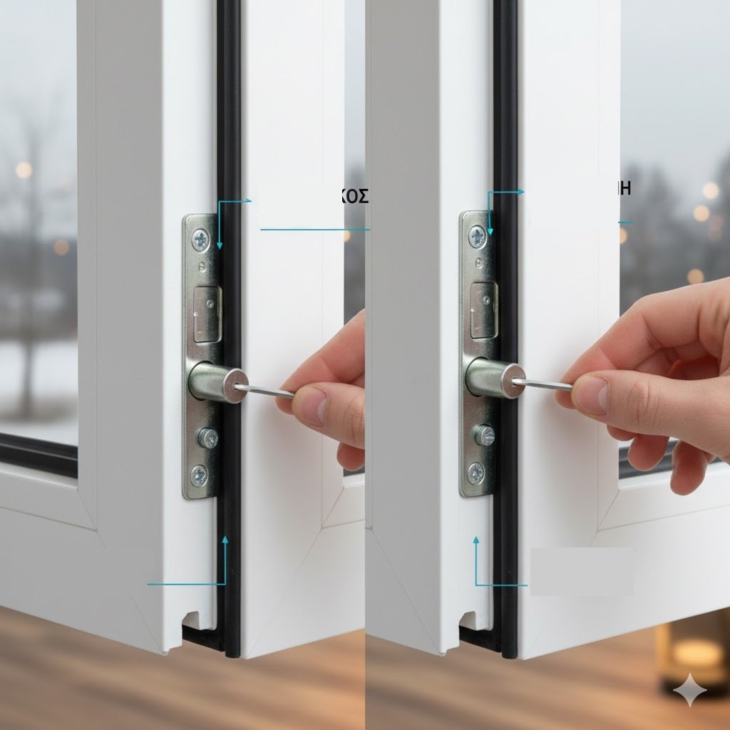 • Πώς το Ρυθμίζετε: Με την πόρτα ανοιχτή, στρέφετε τον πείρο (συνήθως με ένα κλειδί Άλεν ή έναν ίσιο κατσαβίδι, ανάλογα με τον τύπο) έτσι ώστε το μεγαλύτερο μέρος του να “κοιτάζει” προς το λάστιχο (εσωτερικό) του παραθύρου.