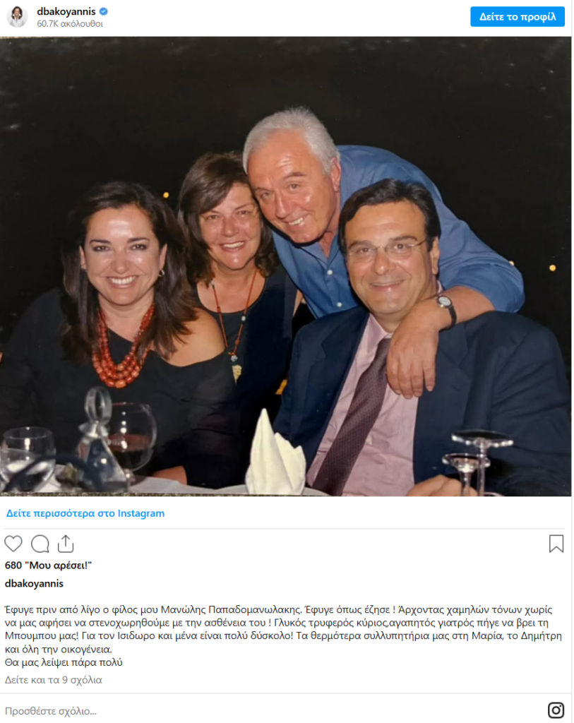 «Έφυγε πριν από λίγο ο φίλος μου Μανώλης Παπαδομανωλακης. Έφυγε όπως έζησε ! Άρχοντας χαμηλών τόνων χωρίς να μας αφήσει να στενοχωρηθούμε με την ασθένειά του ! Γλυκός τρυφερός κύριος, αγαπητός γιατρός πήγε να βρει τη Μπουμπου μας! Για τον Ισιδωρο και μένα είναι πολύ δύσκολο! Τα θερμότερα συλλυπητήρια μας στη Μαρία, το Δημήτρη και όλη την οικογένεια.